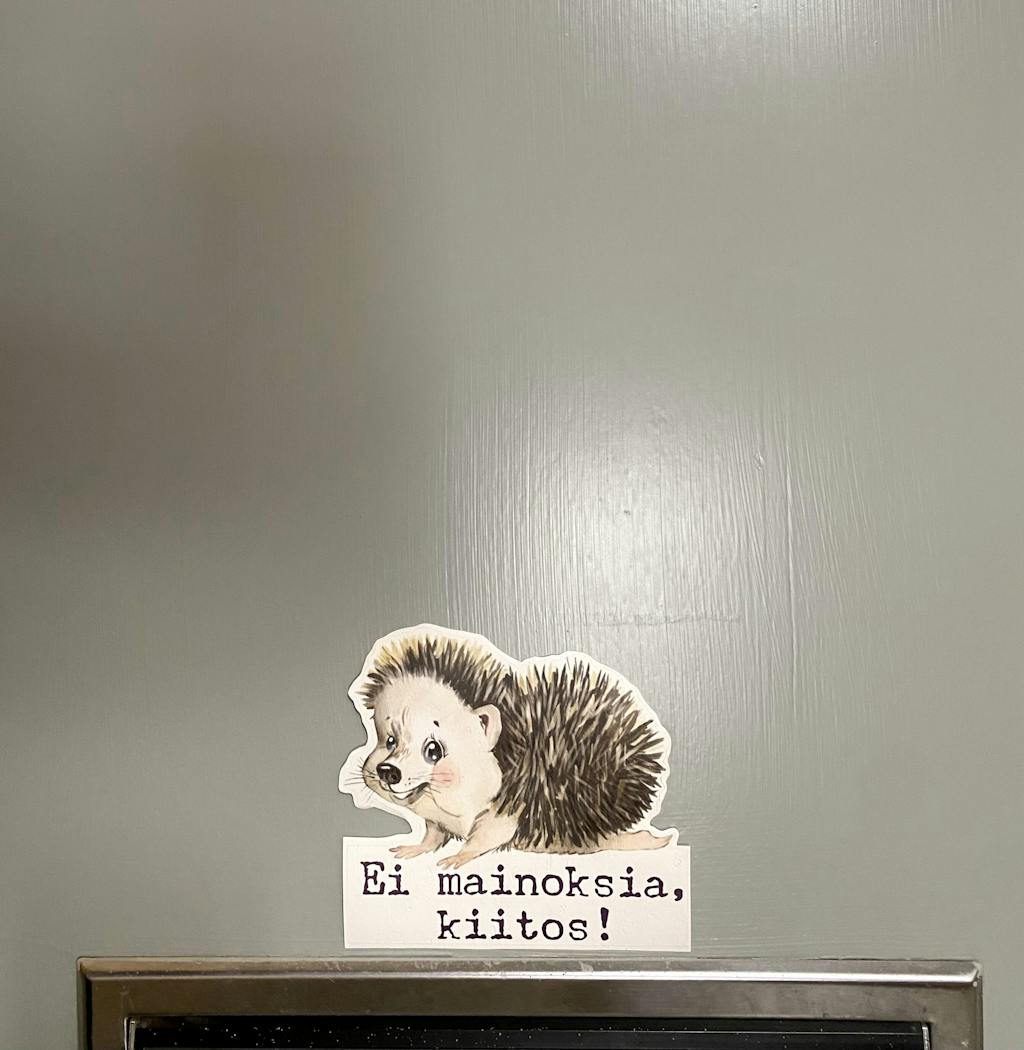 "Ei mainoksia, kiitos!" -tarra on käytännöllinen ja ympäristöystävällinen tapa tehdä selvää tarpeettomasta mainospostista.